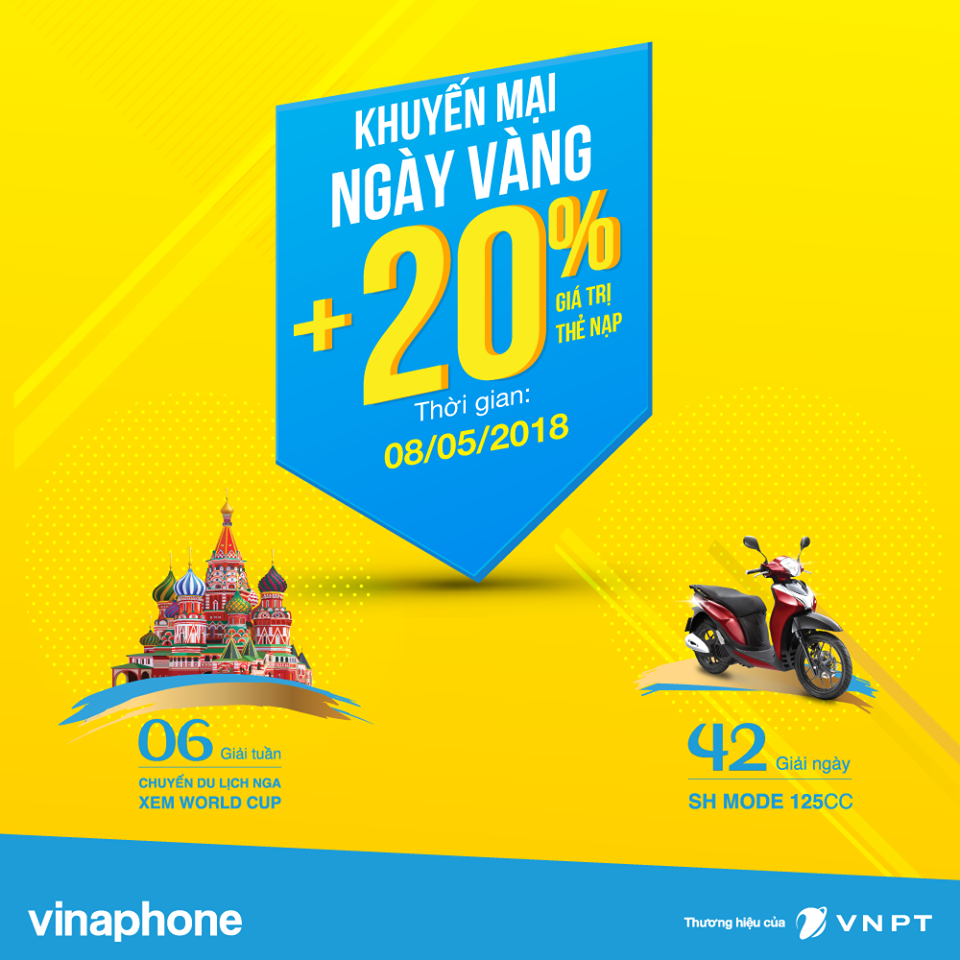 Vinaphone khuyến mãi 20% thẻ nạp ngày vàng 8/5/2018: